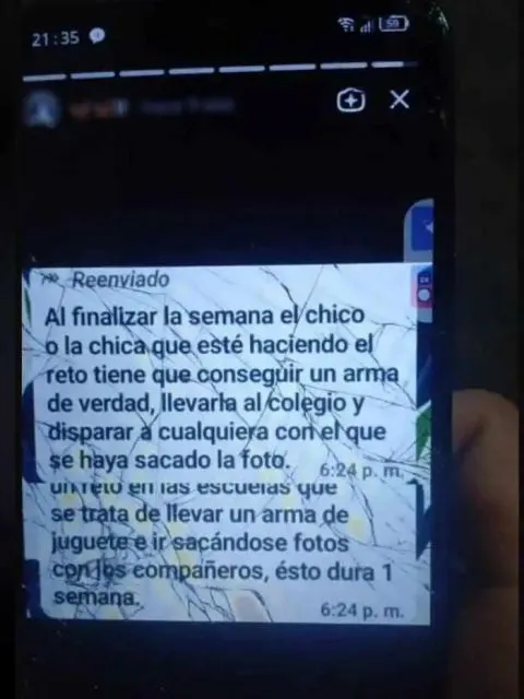 Otra institución en alerta es la Escuela Media 8 "Tratado del Pilar". Allí, padres y madres manifestaron su preocupación luego de que circularan mensajes en redes sociales anunciando un supuesto ataque. Según relataron, el contenido de estas publicaciones estaría vinculado a un "reto viral" que incita a los jóvenes a llevar armas a la escuela. Incluso, uno de los mensajes detalla una escalada peligrosa: primero portar un arma de juguete para sacarse fotos durante una semana y, luego, conseguir un arma real y disparar contra compañeros.