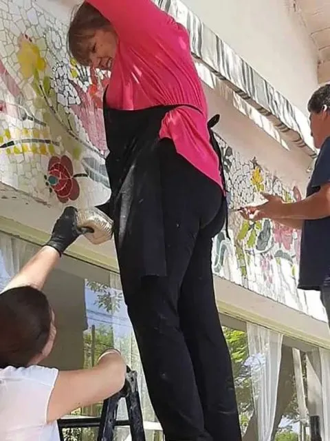 Ayer, luego de cuatro arduos días de trabajo, las alumnas y profesoras del Taller Escuela de Mosaico, reprodujeron una nueva obra en nuestro distrito. Se trata de un colorido mural rodeado de flores y pajaritos, en el Hogar de Ancianos “Silvio Braschi”, ubicado sobre Tucumán.